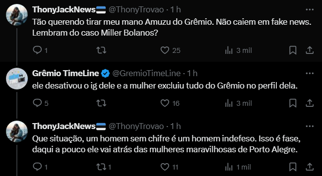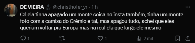 O burburinho cresceu ainda mais após outra informação divulgada pelo mesmo perfil. Segundo eles, Amuzu teria desativado sua conta no Instagram. Um detalhe que, na era digital, costuma ser interpretado como sinal de crise pessoal. Além disso, uma seguidora respondeu à postagem afirmando que a esposa do jogador apagou diversas fotos em que aparecia com a camisa do Grêmio, reforçando a especulação de que o casal estaria enfrentando problemas.