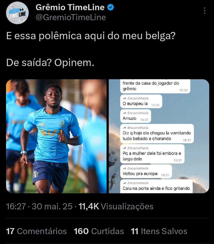 Uma postagem feita pelo perfil Grêmio TimeLine, no X (antigo Twitter), movimentou os bastidores do Tricolor nas últimas horas. O conteúdo trouxe à tona uma possível situação delicada envolvendo o atacante Amuzu, que, segundo relatos, teria protagonizado um episódio pessoal conturbado fora dos gramados.